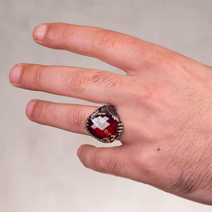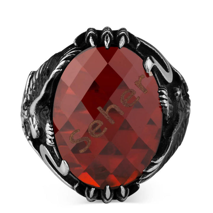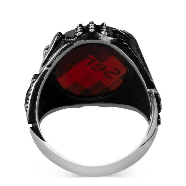 Customizable Silver Mens Ring with Red Zircon Stonework