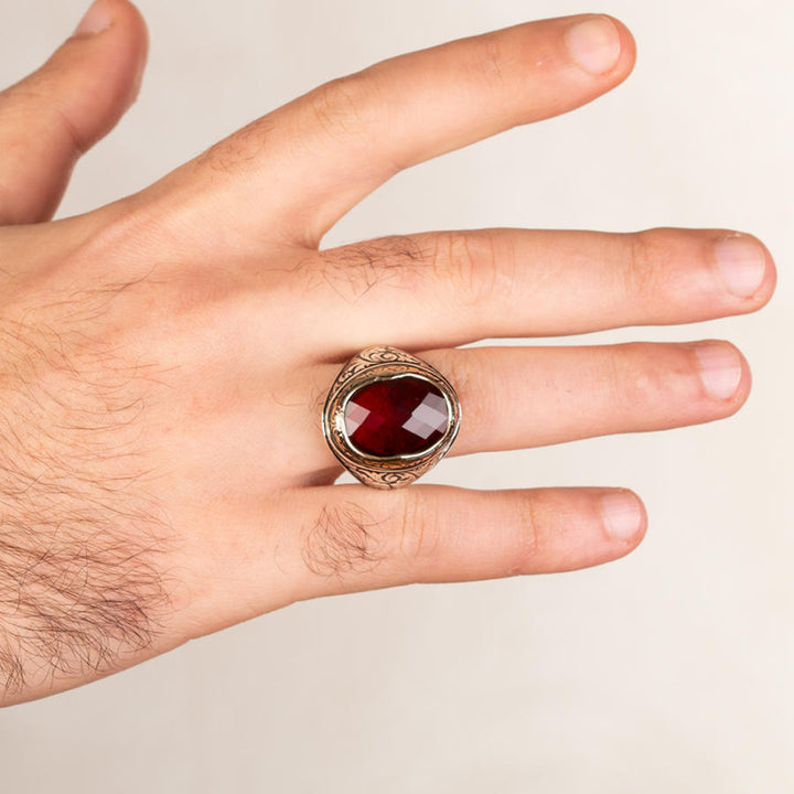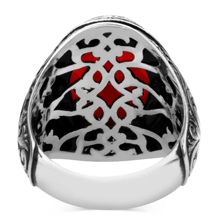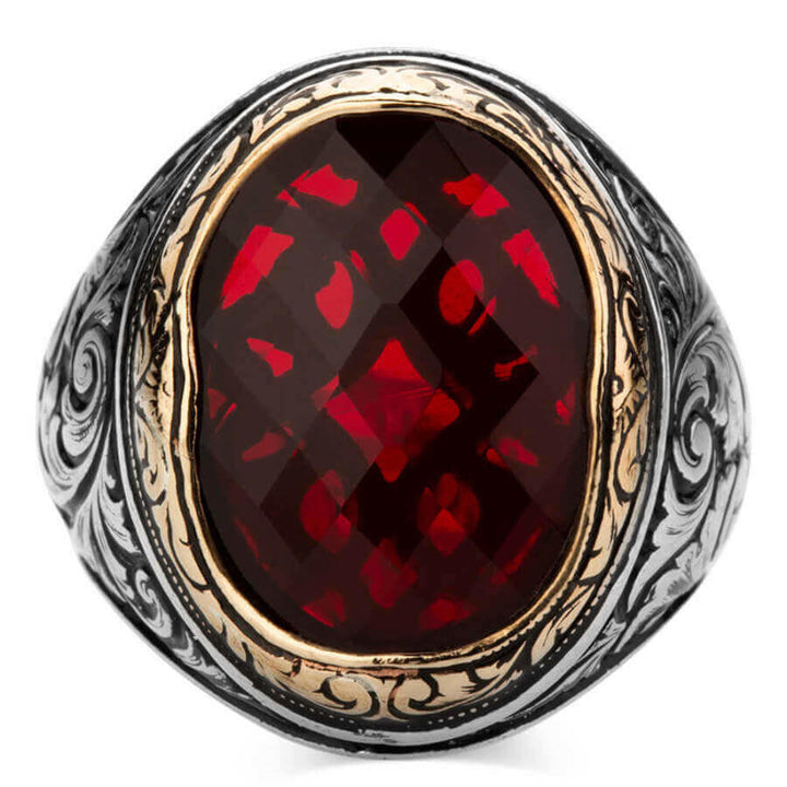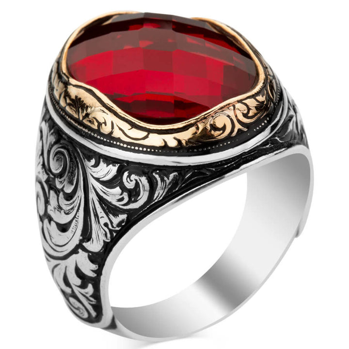 Intricately Inlaid Sterling Silver Mens Ring with Red Zircon Stonework