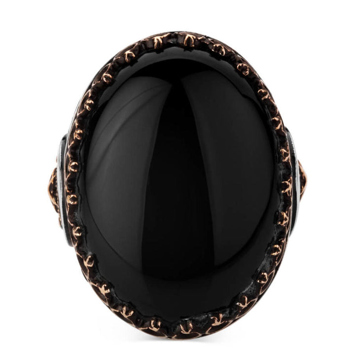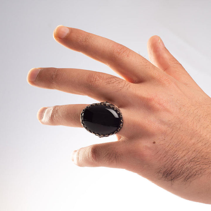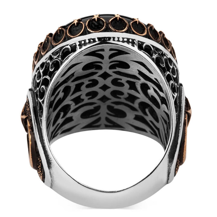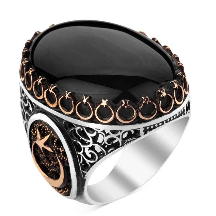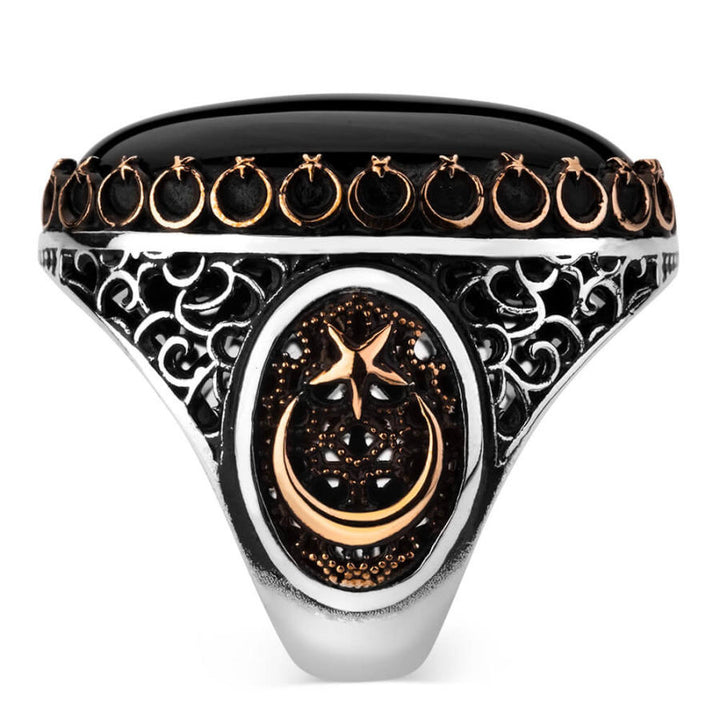 Large Silver Crescent Star Mens Ring with Black Onyx Stone