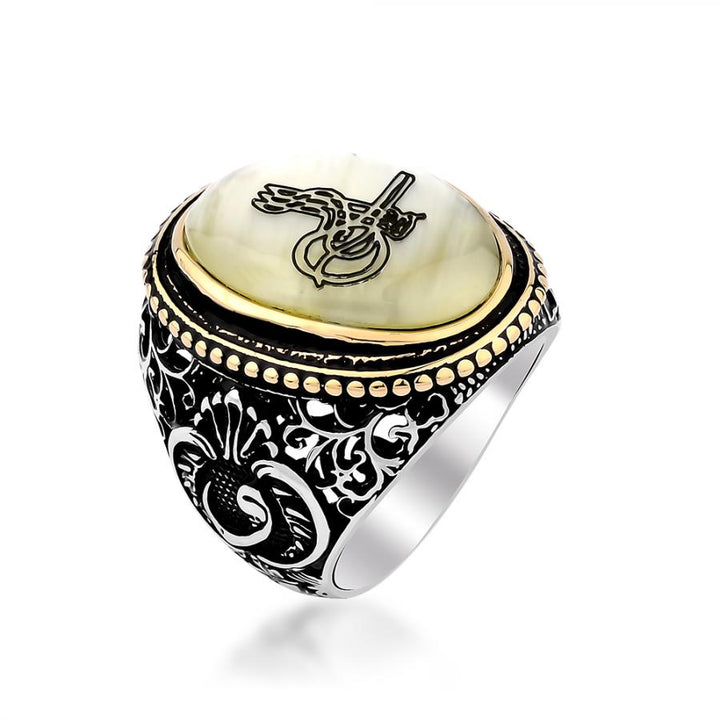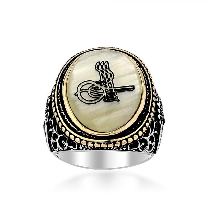 Silver Mens Ring with Tughra Design on Mother of Pearl