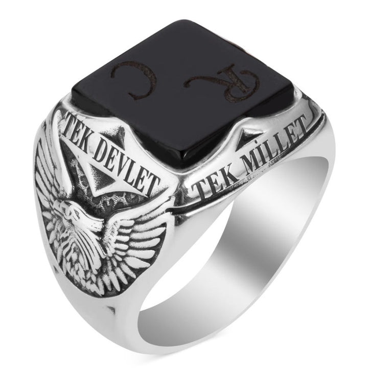 Silver One Nation One Flag Mens Ring with Onyx Stone