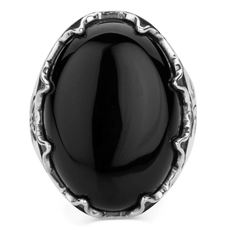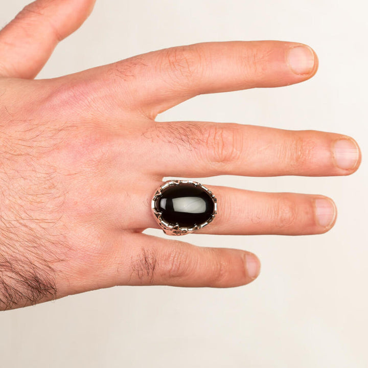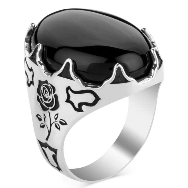 Silver Tulip Motived Mens Ring with Black Onyx Stone