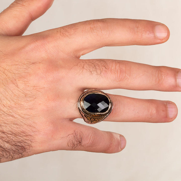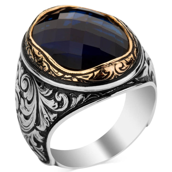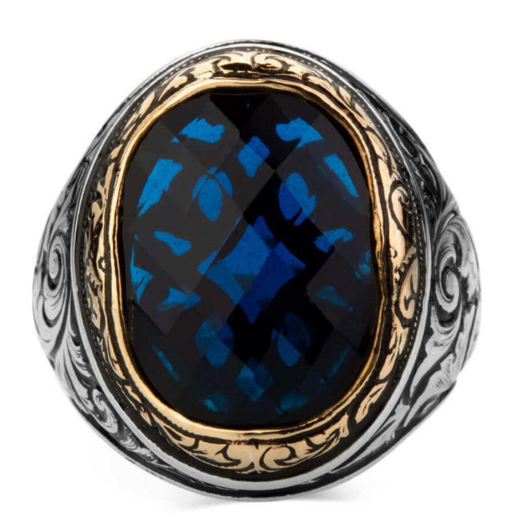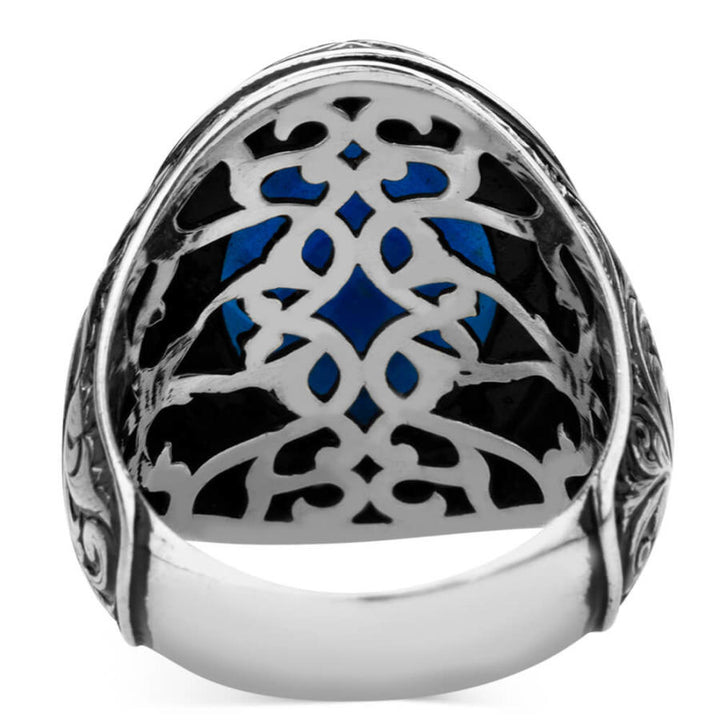 Sterling Silver Intricately Inlaid Mens Ring with Blue Zircon Stone