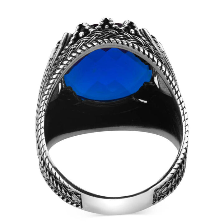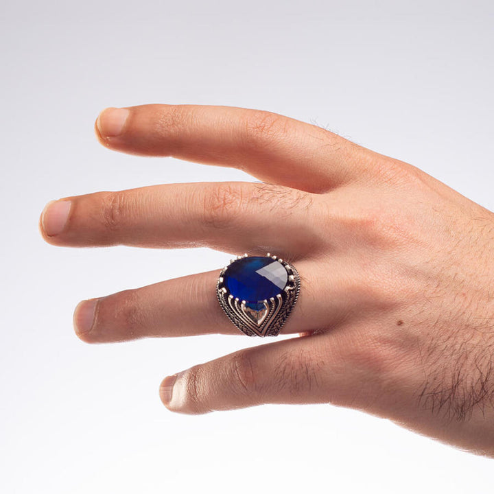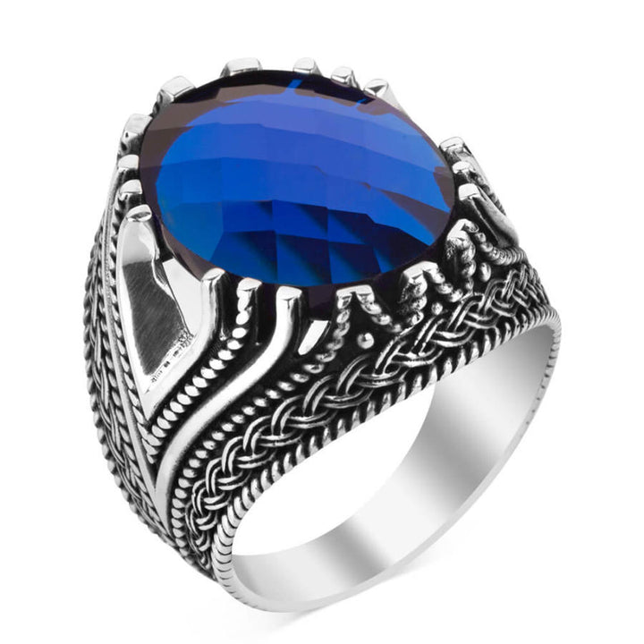 Sterling Silver Mens Ring with Faceted Blue Zircon Stone