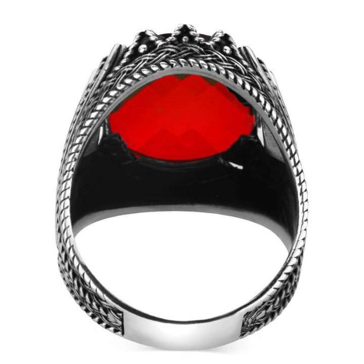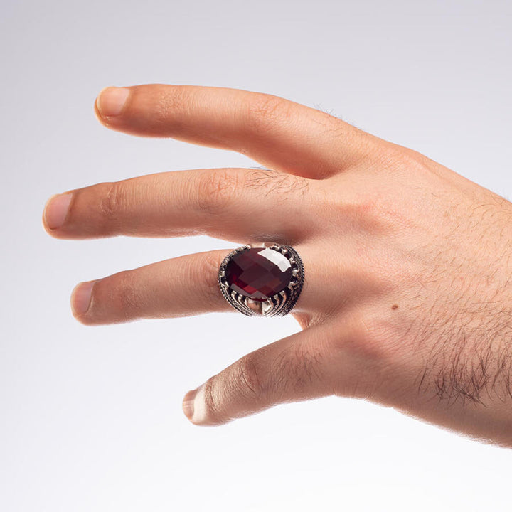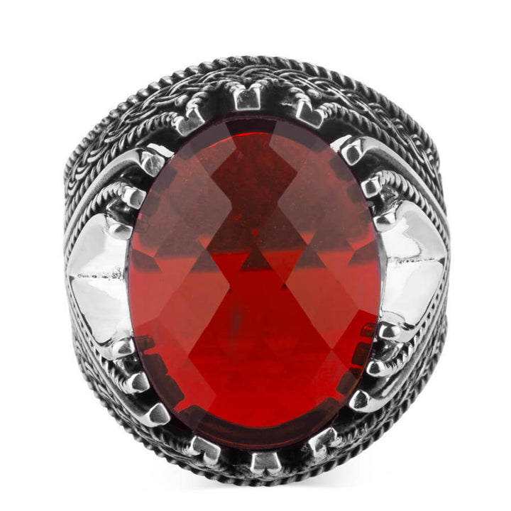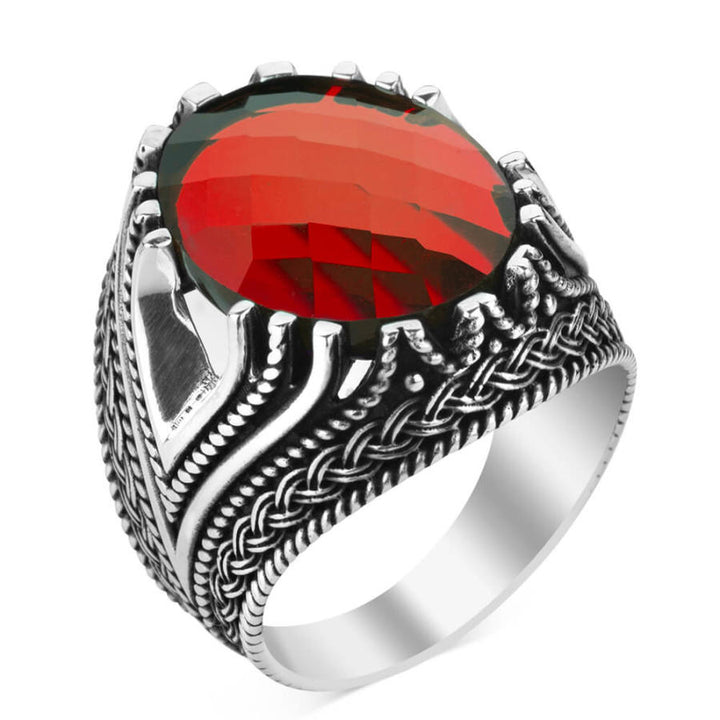 Sterling Silver Mens Ring with Faceted Red Zircon Stone