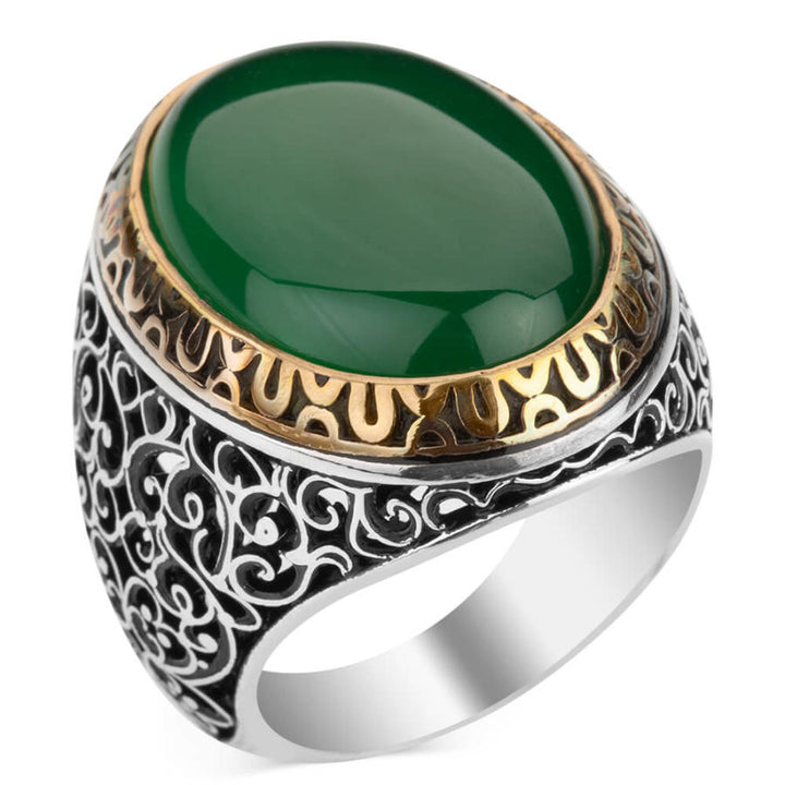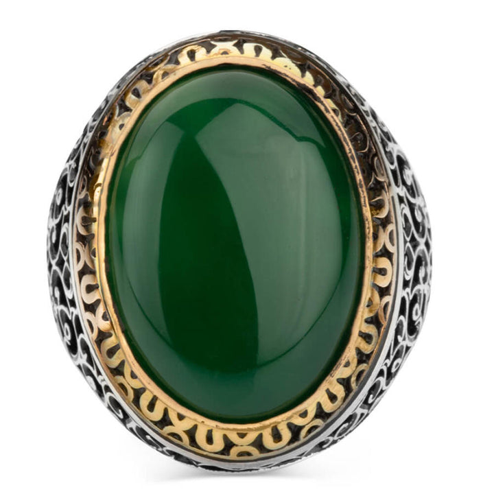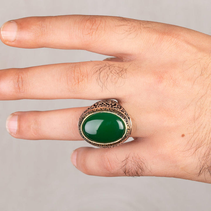 Sterling Silver Symmetrical Mens Ring with Green Agate Stone